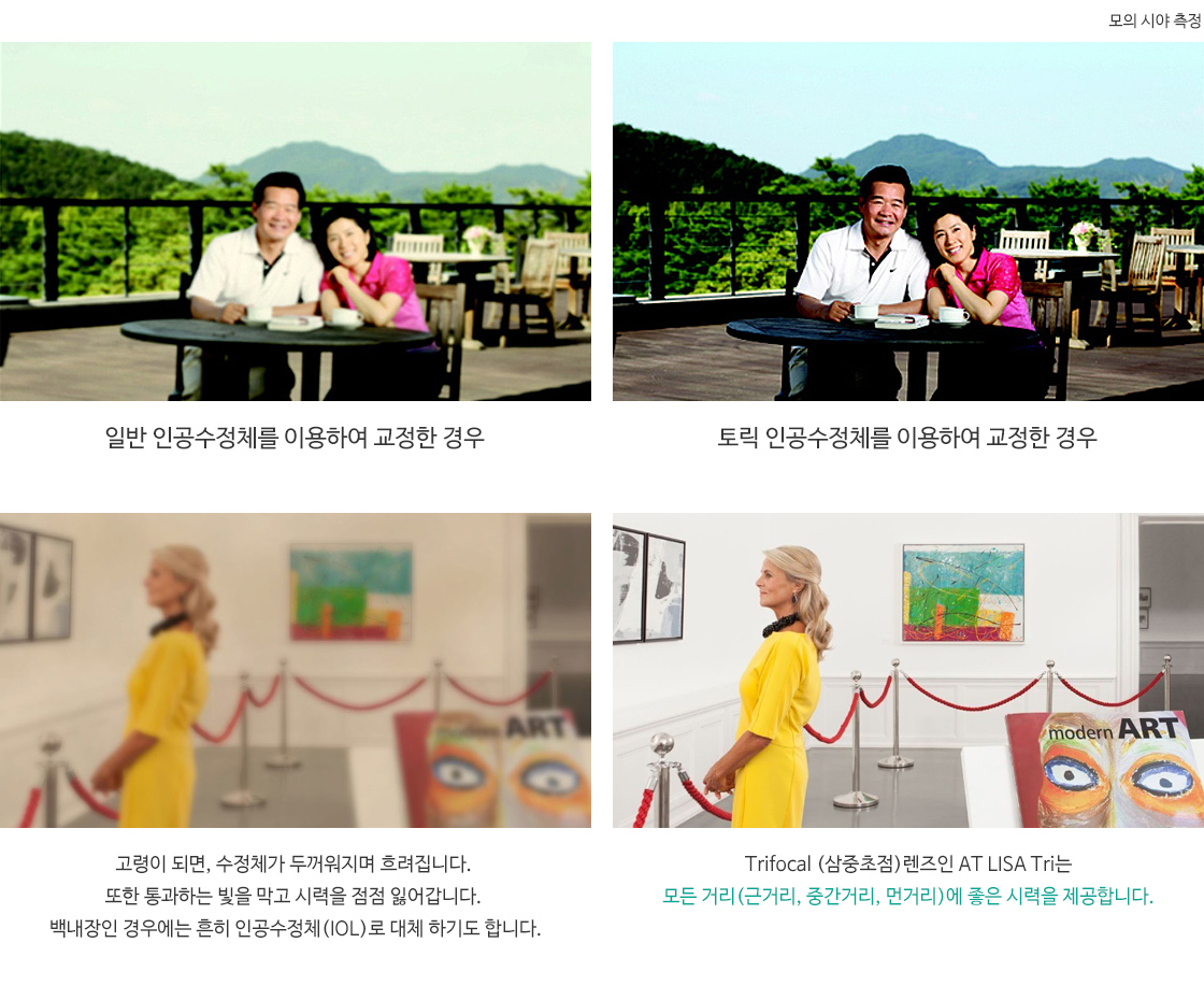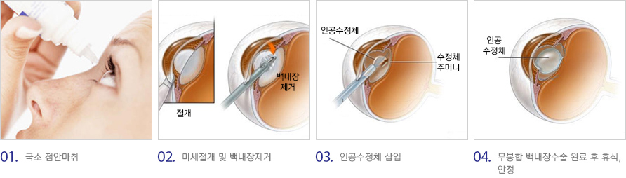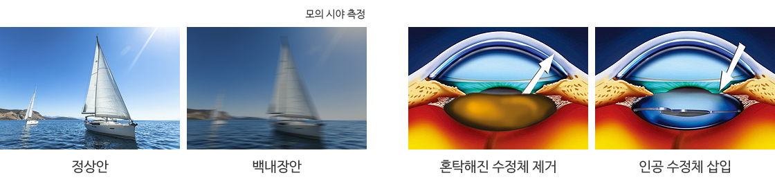 백내장은 서서히 진행하는 질환으로 초기에는 진행을 억제하는 약물 치료를 시도해 볼 수 있습니다. 시력 저하가 진행되고 일상생활에 불편함이 느껴지게 되면 수술적 치료를 고려하게 됩니다. 수술 시 백내장 이외의 문제가 없는 경우에는 정상으로의 시력 회복을 기대할 수 있습니다. 하지만 고령에 의한 망막 노화나 시축을 담당하는 각막 및 유리체 등에 혼탁이 있는 경우에는 수술 전 보다는 시력의 개선을 기대할 수 있으나 회복 정도를 예상할 수는 없습니다.